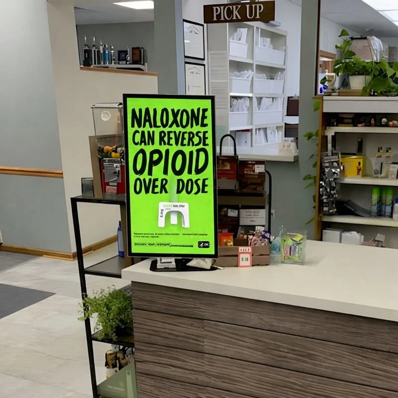 At the counter, take-home brochures allow patients to continue engaging with the content after leaving, while counter mats and window clings reinforce the message during transactions. When combined, these formats create multiple touchpoints within a single visit, increasing the likelihood of recall and action.